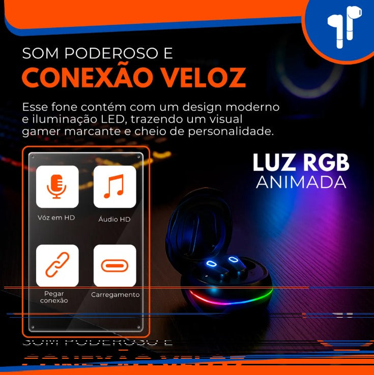 Luz ambiente RGB animada: Estojo e fones com visual moderno, estiloso e perfeito para quem gosta de um toque gamer.